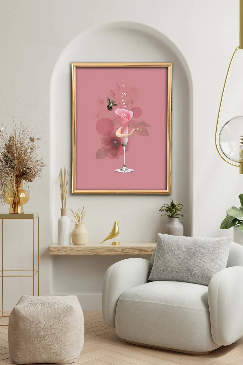 Minimalistyczny kolaż w odcieniach dojrzałego różu wnosi do aranżacji wnętrza wiele symboliki. Zamiast szklanego kielicha, mamy kielich kwiatu. Zza niego wychyla się wąż, nad którego głową unosi się koliber (symbol niezależności i wolności).