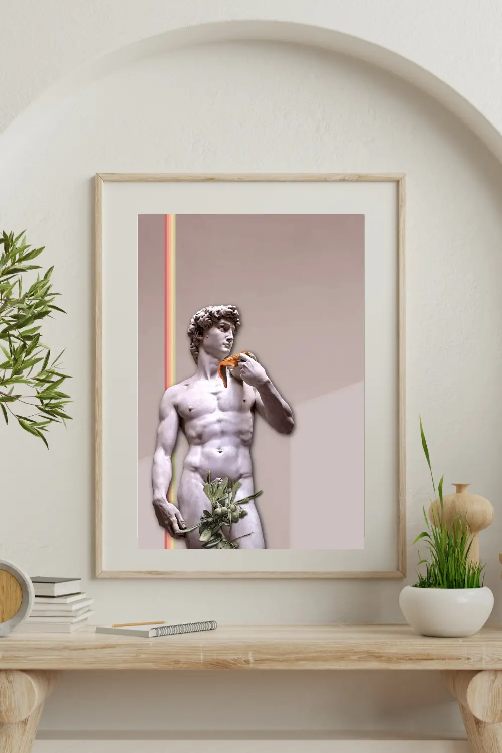 Kolorowe pasy nadają dynamikę całej kompozycji, a pizza w dłoni posągu Davida jest traktowana jako popkulturowy akcent.