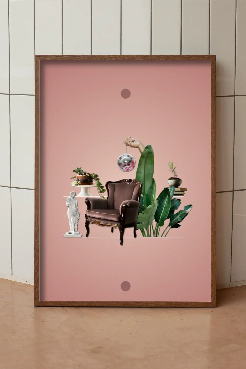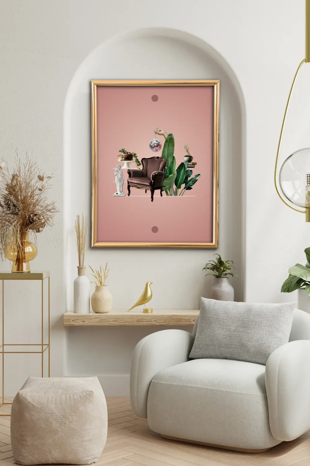 Minimalistyczna kompozycja na lekko rozjaśnianym, różowym tle. Oś kompozycji stanowią poziome linie, które nawiązują do poziomych półek na ścianie. Na nich znajdują się elementy aranżacji przytulnego wnętrza: natura, inspiracje, miejsce relaksu oraz klasycystyczne dekoracje.